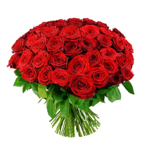 Suur lillekimp punastest roosidest. Kimp koosneb 50 pikast 70 cm punasest roosist, mis on seotud kokku punase paelaga.